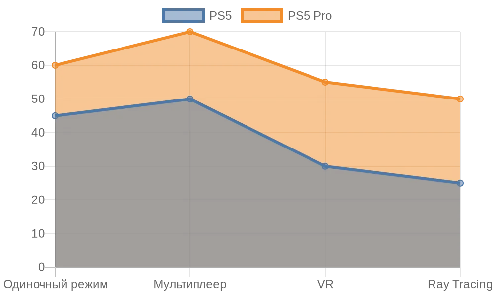Чтобы иллюстрировать влияние на производительность в разных сценариях, рассмотрим линейную диаграмму прогресса FPS в типичной игре от PS5 к PS5 Pro.